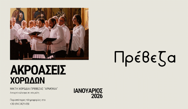 Η Μικτή Χορωδία Πρέβεζας «Αρμονία» ανοίγει τον Ιανουάριο του 2026 τις πόρτες της σε νέους χορωδούς, προσκαλώντας άνδρες και γυναίκες έως 40 ετών που αγαπούν το τραγούδι και θέλουν να γίνουν μέρος μιας ζωντανής μουσικής ομάδας.