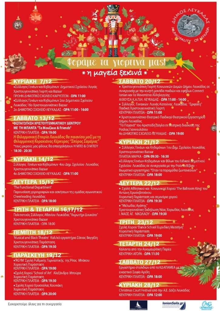 Ο Δήμος Λευκάδας, επιδιώκοντας να αναδείξει το εορταστικό κλίμα της πόλης και να προσφέρει σε μικρούς και μεγάλους στιγμές χαράς, δημιουργίας και ζεστασιάς, προσκαλεί όλους τους δημότες και επισκέπτες να λάβουν μέρος και φέτος στις χριστουγεννιάτικες εκδηλώσεις και να μοιραστούν μαζί μας το μαγικό πνεύμα των Χριστουγέννων.