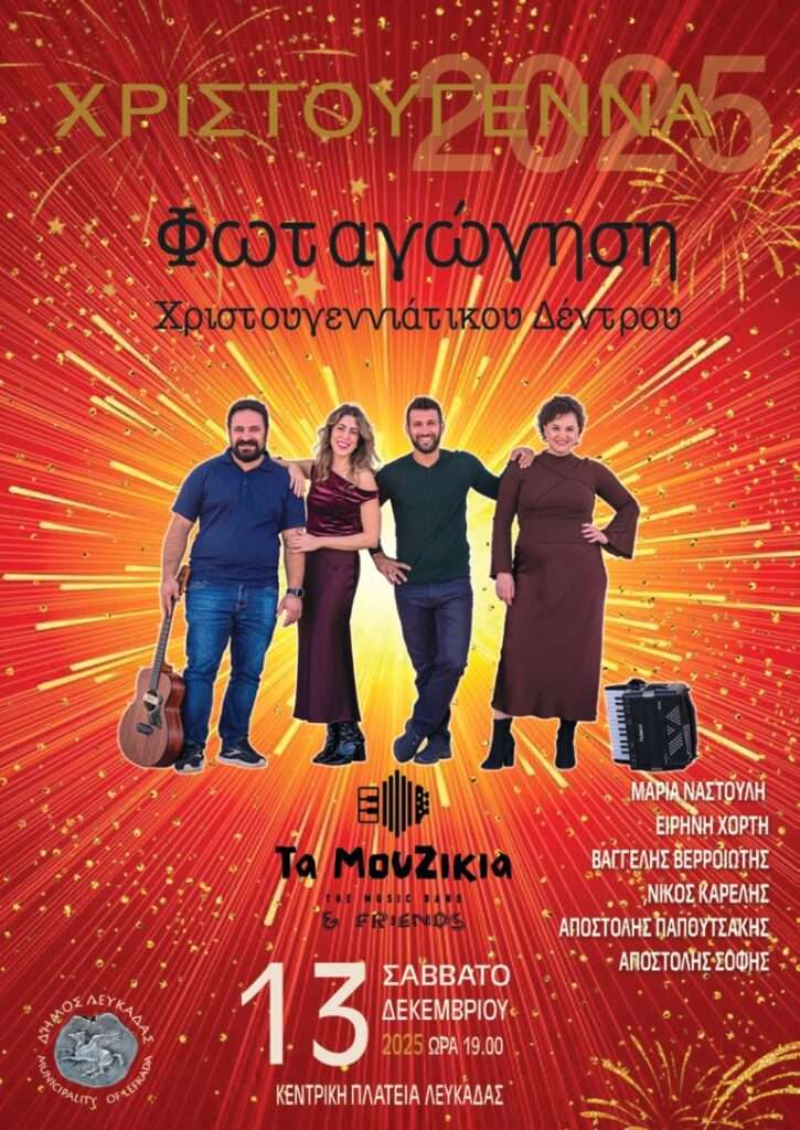 Το Σάββατο 13 Δεκεμβρίου και ώρα 19.00, στην Κεντρική Πλατεία, θα πραγματοποιηθεί η επίσημη φωταγώγηση του Χριστουγεννιάτικου δέντρου από τον Δήμαρχο Λευκάδας, Δρ. Ξενοφώντα Ν. Βεργίνη, με τη συνοδεία του μουσικού συγκροτήματος  ”Τα Μουζίκια & Friends” . Μουσική, φως και εορταστική διάθεση θα γεμίσουν την πόλη, σηματοδοτώντας τη λαμπερή έναρξη της φετινής περιόδου.