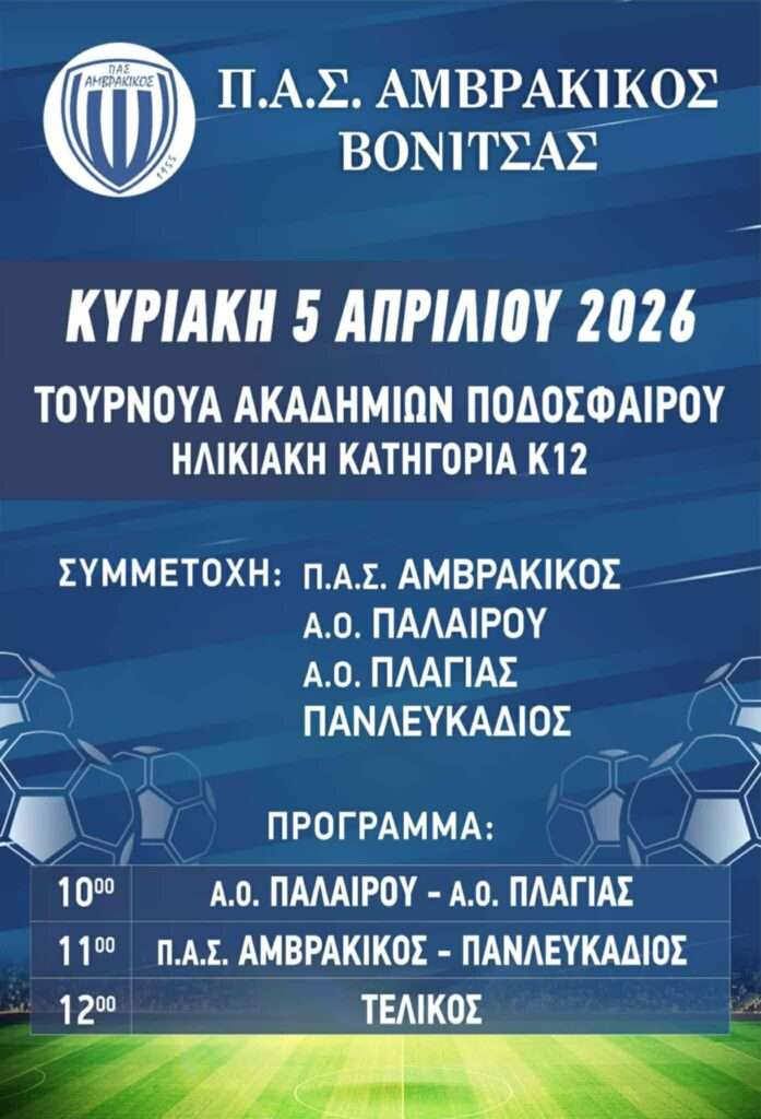 Η Βόνιτσα ετοιμάζεται να υποδεχθεί το μέλλον του τοπικού ποδοσφαίρου, τηην Κυριακή 5 Απριλίου 2026. Το γήπεδο της πόλης θα γεμίσει παιδικές φωνές και αθλητική δράση, καθώς ο Π.Α.Σ. Αμβρακικός διοργανώνει ένα μεγάλο τουρνουά ακαδημιών για την κατηγορία Κ12, με τη συμμετοχή του Α.Ο. Παλαίρου, του Α.Ο. Πλαγιάς και του Πανλευκάδιου.