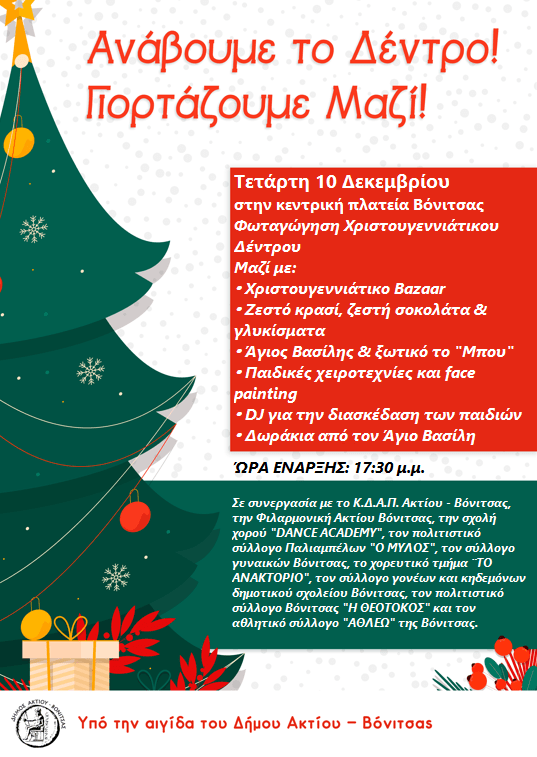 Τετάρτη 10/12/2025, στις 17:30, στην κεντρική πλατεία Βόνιτσας θα πραγματοποιηθεί η επίσημη φωταγώγηση του Χριστουγεννιάτικου δέντρου, σε μια εκδήλωση που έχει στόχο να προσφέρει ένα οργανωμένο και φιλικό γιορτινό περιβάλλον για κατοίκους και επισκέπτες.